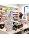 Espositore girevole in metallo laccato bianco con 16 tasche, già fornito di biglietti d'auguri assortiti per ogni ricorrenza (Matrimoni, nascite, compleanni e tappe religiose). Design compatto salvaspazio, ideale per banconi e punti cassa.
